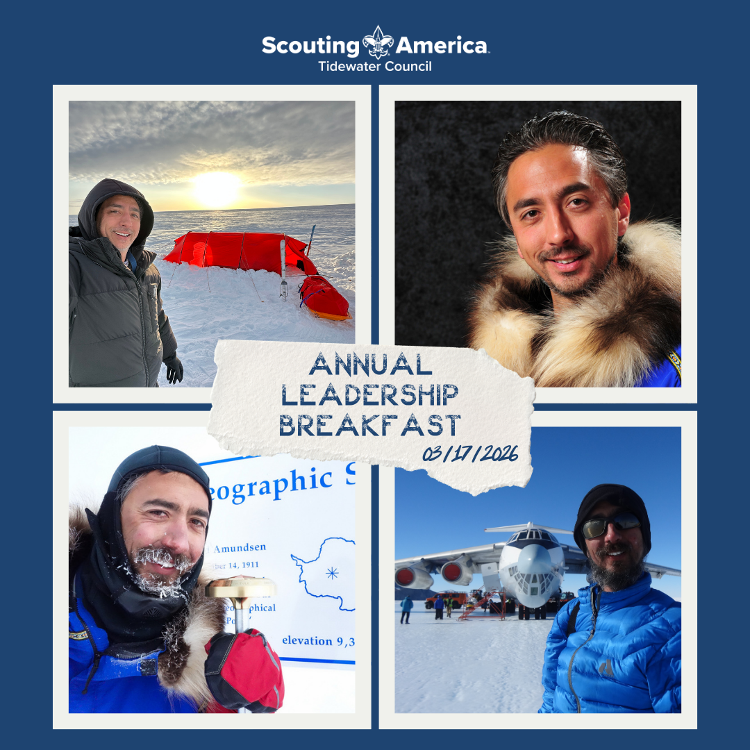 Join Tidewater Council for the Annual Leadership Breakfast on Tuesday, March 17, featuring Aaron Linsdau! Aaron is an adventurer, explorer, author, inventor, photographer, and NESA Outstanding Eagle Scout. He holds the world record for the longest expedition to the South Pole, and brings powerful stories of leadership, resilience, and purpose that align perfectly with Scouting’s mission.